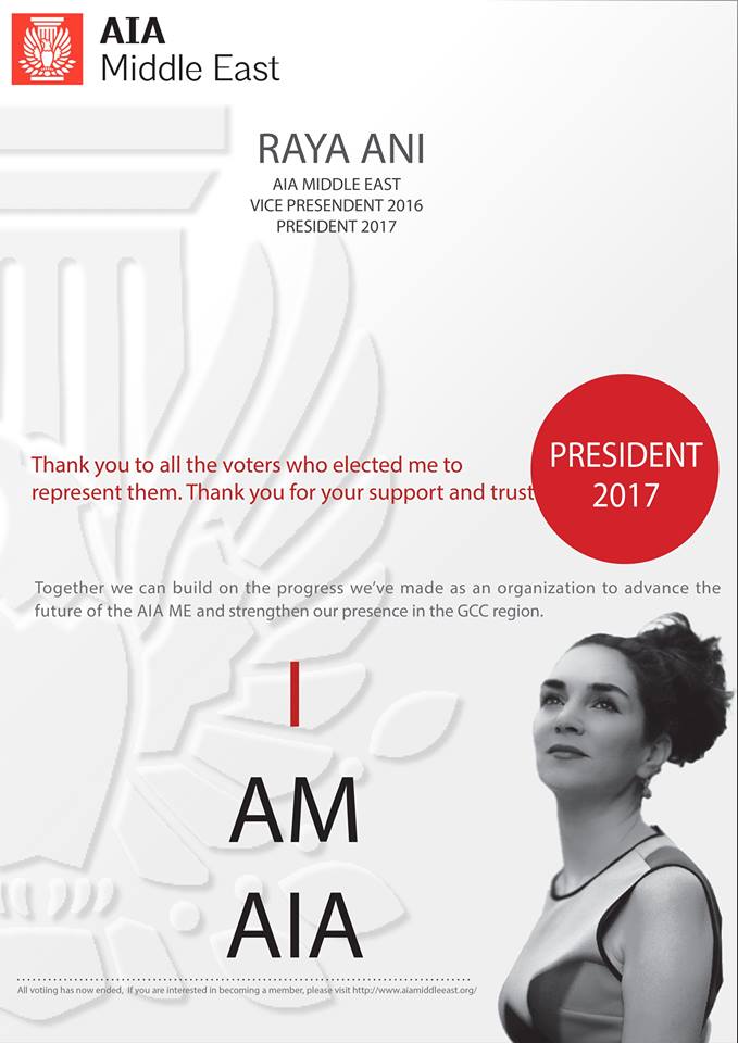 I have been elected as the American Institute of Architects- Middle East- 2016 Vice President, 2017 President.